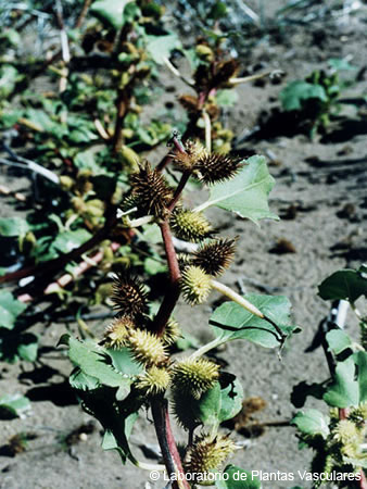 Hierba ramificada, semejante a "cepa caballo" (Xanthium spinosum), pero con hojas más anchas y ásperas, de color verde claro en ambas caras; con abrojos mayores.